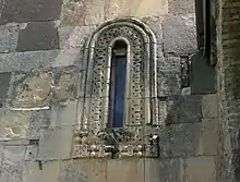 The sanctuary is flanked by pastophoria on either side, connecting to the corresponding naves with arched openings. Both are covered with domical vaults, supported by four squinches. The sanctuary is separated from the rest of the bay by an ornate wood-engraved iconostasis installed in 1781. Fragments of the late medieval frescoes are visible in part of the interior. The dome has tinplate roofing; the rest of the roof is tiled. The façades are adorned with decorative stone carvings, especially around the doorways and windows.[2] A special decorative feature of the cathedral is polychromy, both exterior and interior. The façades and the interior of the northern aisle are laid out in colorful quadras. The ornament of the apse floor is adorned in three color stones. Fine ornamentation covers cornices.