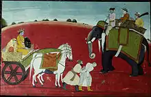 Rukmi (Sanskrit: रुक्मी) the ruler of Vidarbha according to the epic Mahābhārata. He was the son of the king Bhishmaka and elder brother of Rukmini.[1] The Harivamsha mentions that Rukmi was trained in the arts of warfare by the Kimpurusha Druma. Krishna married Rukmini by abducting her from the Vidarbha kingdom, though Rukmi wanted to give her as a bride to Chedi king Shishupala. He fought with Krishna but was defeated. When Krishna was about to kill him, Rukmini begged that spare her brother's life. Krishna agreed and let Rukmi go free, but not before having his head shaved as a visible sign of a warrior's defeat.[2]