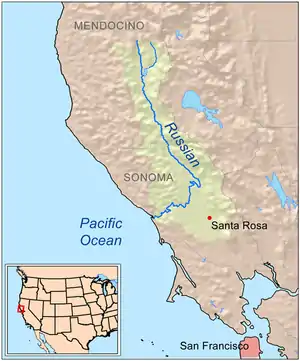 The Russian River (Southern Pomo: Ashokawna, Russian: Рашен-Ривер (Rašen-Rivyer), lit. 'русская река (Russkaya Ryeka)', Spanish: Río Ruso) is a southward-flowing river that drains 1,485 sq mi (3,850 km2)[4] of Sonoma and Mendocino counties in Northern California. With an annual average discharge of approximately 1,600,000 acre feet (2.0 km3),[6] it is the second-largest river (after the Sacramento River) flowing through the nine-county Greater San Francisco Bay Area, with a mainstem 110 mi (180 km) long.
