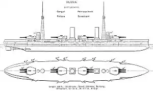 The main armament of the Ganguts consisted of a dozen 52-caliber Obukhovskii 12-inch (305 mm) Pattern 1907 guns mounted in four triple turrets distributed the length of the ship. The Russians did not believe that superfiring turrets offered any advantage, discounting the value of axial fire and believing that superfiring turrets could not fire while over the lower turret because of muzzle blast problems. They also believed that distributing the turrets, and their associated magazines, over the length of the ship improved the survivability of the ship. Sixteen 50-caliber 4.7-inch (119 mm) Pattern 1905 guns were mounted in casemates as the secondary battery intended to defend the ship against torpedo boats. The ships were completed with only a single 30-caliber 3-inch (76 mm) Lender anti-aircraft (AA) gun mounted on the quarterdeck. Other AA guns were probably added during the course of World War I, but details are lacking.[3] Conway's says that four 75-millimeter (3.0 in) were added to the roofs of the end turrets during the war.[4] Four 17.7-inch (450 mm) submerged torpedo tubes were mounted with three torpedoes for each tube.[3]