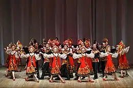 The original Russian folk dance traditions continue to play an important part in the culture of the country and have been in constant interaction with Russia’s many ethnic groups.[2] Russian folk dances are also in interrelations with other types of artistic expressions.[3] One example can be seen in the Ballets Russes, which invokes Russian folk dances and music in its pieces.