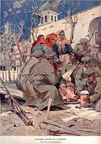 When Austria regained Galicia in June 1915, most of the remaining Russophiles and their families retreated alongside the Russian army in fear of reprisals.[9] "Galician Russians" were granted exemptions by the Russian government to the traditional 5-year residency requirement for Russian citizenship,[12] and approximately 25,000[9] of them were resettled near Rostov-on-Don. In addition, many Jews and ethnic Germans were accused of being spies and deported east. The flood of refugees was so great that they blocked the roads, interfering with Russian military movements.[12] Among the Russophiles who stayed in Galicia, the Austrians arrested and sentenced to death approximately thirty noted Russophiles, including two members of the Austrian parliament, Dmytro Markov and Volodymyr Kurylovich (their sentences were commuted to life imprisonment and they were released in 1917),[15] as well as Metodyj Trochanovskij. Kost Levitsky, a prominent Ukrainophile leader and the future president of the West Ukrainian National Republic, appeared as a prosecutor during the trials against the Russophiles.