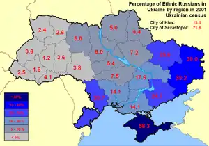 | In the 2001 Ukrainian census, 8,334,100 identified themselves as ethnic Russians (17.3% of the population of Ukraine).[1] | |