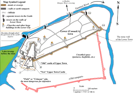In July 1678, the Turkish army (approx. 70,000 men) of the Grand Vizier Kara Mustafa with Crimean Tatar army (up to 50,000 men) besieged Chyhyryn once again.[9] The Russian and Ukrainian armies (70-80,000) crossed the Dnieper after a long delay, broke through the fortified position of the Turkish covering force on 3 August and turned them into the flight. Then they entrenched on the left bank of the Tiasmyn River opposite the fortress with the siege Turkish-Crimean army on the other bank. The crossings were destroyed and it was difficult to attack the Turks. The troops could freely enter the Chyhyryn, but it was already surrounded by well-equipped siege positions and was heavily bombarded; its fortifications were badly damaged. When the Turks broke into the Lower Town of Chyhyryn on August 11, Romodanovsky ordered to leave the citadel and withdraw troops to the left bank of Tiasmyn. Finally, the Russians blew up the powder magazine and destroyed the citadel. Then the Russian-Ukrainian army retreated beyond the Dnieper, beating off the pursuing Turkish army, which would finally leave them in peace. Later the Turks seized Kanev and established the power of Yuri Khmelnitsky on the most of Right-bank Ukraine, but did not dare to go to Kiev, where the Russian troops were stationed.[11][12]