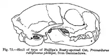 Felis rubiginosa was the scientific name used by Isidore Geoffroy Saint-Hilaire in 1831 for a rusty-spotted cat specimen from Pondicherry, India.[5] Prionailurus was proposed by Nikolai Severtzov in 1858 as a generic name.[6] Prionailurus rubiginosus phillipsi was proposed by Reginald Innes Pocock in 1939 who described a specimen from Central Province, Sri Lanka and subordinated both to the genus Prionailurus.[3]