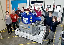 The National Institute for Research in Nuclear Science (NIRNS) was formed in 1957 to operate the Rutherford High Energy Laboratory established next to the Atomic Energy Research Establishment on the former RAF Harwell airfield between Chilton and Harwell. The 50 MeV proton linear accelerator[2] was transferred from the Atomic Energy Research Establishment to the new laboratory to become a national facility for particle physics as the Nimrod (synchrotron). Some components of this linear accelerator are still operating as part of the ISIS Neutron and Muon Source injector linac over 50 years after their first use.[3] Since then the laboratory has grown both with the expansion of its established facilities, and the incorporation of facilities from other institutions to provide the benefits from economies of scale. The major mergers were in 1975 with the adjacent Atlas Computer Laboratory creating the Rutherford Laboratory, and then in 1979 with the Appleton Laboratory to form the current Rutherford Appleton Laboratory. With the closure of the Royal Greenwich Observatory in 1998, some small offices also moved to RAL. Similarly, laser technology moved to RAL from Joint European Torus at Culham to become the foundation of the Central Laser Facility.