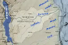 Ruvuma River, formerly also known as the Rovuma River, is a river in the African Great Lakes region. During the greater part of its course, it forms the border between Tanzania and Mozambique (in Mozambique known as Rio Rovuma). The river is 800 kilometres (497 mi) long, with a drainage basin of 155,500 square kilometres (60,000 sq mi) in size. Its mean annual discharge is 475 m³/s (16,774 CFS) at its mouth.[1]