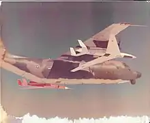 The Model 154 had an engine on the top of the fuselage to reduce its radar cross-section and infrared signature as seen from below, as well as twin inward-canted tailfins to conceal the exhaust stream. It had a fuselage with flat bottom. A ground radar would need to be directly below the drone to detect it, but by the time it is detected, the aircraft is travelling away, which makes tracking difficult. The sides of the fuselage are sloped flat to deflect radar signals. It was built using a high percentage of plastic composite materials, which had a lower radar reflectivity than metal. The leading and trailing edges of the wings had inset triangles of a radar-absorbent material.[1][2] The aircraft was powered by a General Electric YJ97-GE-3 turbojet providing 4,000 pounds (1,815 kg) thrust, with the engine exhaust mixed with cool air to reduce its infrared signature. The YJ97 was derived from a General Electric demonstrator engine designated the "GE1".