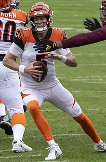 On November 22, 2020 against the Washington Football Team, Finley came into the game in the third quarter after starter Joe Burrow left the game with a left leg injury.[17][18] Finley completed 3 of 10 passes for 30 yards, an interception, and a 0.0 passer rating as the Bengals lost 20–9.[19] The following week, Bengals coach Zac Taylor named Brandon Allen the starting quarterback over Finley.[20] Finley was named the starter for the Week 15 matchup against the Pittsburgh Steelers. Finley passed for 89 yards and a touchdown, and had 47 yards rushing, including a 23 yard rushing touchdown during the 27–17 win against the heavily favored Steelers, marking Finley's first win as an NFL quarterback.[21][22]