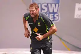 Ryan James Harris (born 11 October 1979) is an Australian cricket coach and former cricketer. He was a right-arm fast-medium bowler who was a member of the Australia national cricket team until retiring in the Ashes tour lead up of 2015 due to a knee injury.[4] It had hampered him for a majority of his career, but despite this, he performed as one of Australia's most highly rated fast bowlers.[5]
