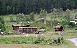Rygnestadtunet is an authentic farmyard consisting of a brook mill (1), farmhouse (2), three-story storehouse ("loft") (3), barn and stable (4), sheephouse (5), barn (6), storehouse on pillars ("loft") (7), blacksmiths workshop (8), and sauna (9). (See the adjacent picture for view of each building.) The custom of building a separate house for each purpose was common in the Setesdal valley until the beginning of the World War II. The museum farmyard only includes the old farmyard, which the newer Nordigard farmyard is situated just below the old one that is now a museum.[4]