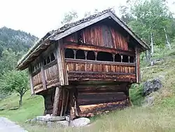 The most noted of all the buildings is Rygnestadloftet, a storehouse on pillars, built in two stories by Vonde-Åsmund (Åsmund the Evil) (1540-1596) in 1590. Rygnestadloftet is highly valued for its fine proportions, its good craftsmanship, and use of good materials. The cog-joint timber has considerable dimensions. The width of one timber log is enough for the height of the entrance door.[4][5]