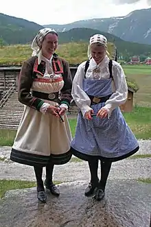 The farmhouse, or "stoga" (a local expression), has two main areas inside. To the left of the main farmhouse entrance, there is the "gammelstog" (literally: "old" stoga) which is a large open room with a central hearth, complete with original furniture and decoration. The timber logs date from before the black plague of 1349-1350 or possibly from the 13th century. To the right of the farmhouse entrance is the "nystog" (literally: "new" stoga). The "nystog" was used for everyday life and some lighter cooking, while "gammelstog" served as a scullery. Both rooms were used for sleeping. The "nystog" was more recently rebuilt and fitted with fireplace and chimney. The sturdy chimney made it possible to build another storey on above this room. In the front of the building, there originally was an external balcony, but it is no longer there. To make the roof ridge on a level and make it possible to have room for the staircase, the headroom in the "gammelstog" was raised accordingly.[6][4]