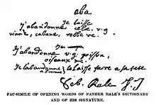 Rale was born in Pontarlier, France and studied in Dijon. In 1675, he joined the Society of Jesus at Dole and taught Greek and rhetoric at Nîmes. He volunteered for the American missions in 1689 and came to the New World in a party led by Governor-general Louis de Buade de Frontenac of New France.[2] His first missionary work was at an Abenaki village in Saint Francois, near Quebec City. He then spent two years with the Illiniwek Indians at Kaskaskia.