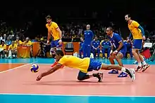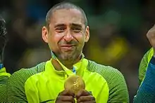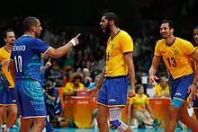 In 2004 he became an Olympic Champion for the first time. However, in the next two Olympics, the Brazilian national volleyball team won silver medals only.[5] Serginho semi-retired from the national team after the 2012 Olympics, and returned only for the 2015 World League.[6] After that he declined to compete at the 2016 Rio Olympics, but was persuaded by Bernardinho to return. Bernardinho claimed that, while Serginho no longer had the agility that made him famous, he had experience and maturity to lead the team during a tournament that would certainly be rife with pressure on the Brazilian team, since they were playing on their country and coming from two losses on previous Olympics. Serginho was essential to motivate his team against France. They were losing, and on a break, Serginho told his colleagues that, while they all had at least one more chance at going to the Olympics, he didn't – those would be his last Olympic Games. Eventually, Brazil won the gold medal against Italy, and Serginho was acclaimed by the cheering fans, who called him king.[7] After the match against Italy, Serginho was named the tournament's most valued player.[8] He announced after the Rio finals against Italy he will play professionally for two more years.