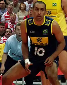 Sérgio Dutra dos Santos, known as Serginho or Escadinha (born 15 October 1975) is a former Brazilian volleyball player, a member of Brazil men's national volleyball team and a former player of Sport Club Corinthians Paulista restructured volleyball team, his beloved club,[3] 2004 and 2016 Olympic Champion, double silver medalist of the Olympic Games (2008, 2012), World Champion (2006, 2010), multimedalist of the World League, South American Championship, World Cup and the Grand Champions Cup, 2011 Brazil Champion. In 2009 he became the first libero to be named Most Valuable Player in the history of the FIVB World League.[4]