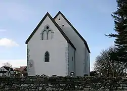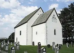The earliest existing historical records of the church date back to the year 1280, but it was likely built around the year 1140. The Romanesque stone church has a rectangular nave and narrower, rectangular chancel. According to tradition, the church was owned for a time by Queen Margrete Skulesdatter. During the restoration in 1883, the windows were greatly expanded and given a neo-Gothic shape, and the steeple which had stood on the roof for hundreds of years was removed. The church was restored in again in 1966, under the leadership of Håkon Christie. Windows and portal openings, which had been greatly expanded in the 19th century, were then restored to their original form and size, including the use of the medieval frame stones, which had been preserved. The stone altar in the choir is the only thing left of the original inventory. The baptismal font is also from the Middle Ages, but the rest of the furniture is newer.[3]