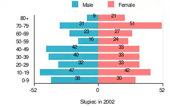 According to the 2002 Poland census, there were 572 people residing in Słupiec village, of whom 48.6% were male and 51.4% were female. In the village, the population was spread out, with 24% under the age of 18, 33.6% from 18 to 44, 16.3% from 45 to 64, and 26.2% who were 65 years of age or older.[1]