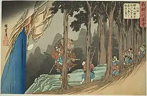 In the Gikeiki, a text concerning the life of Yoshitsune, Sōjōgatani or Bishop's valley is described as being the location of a once popular temple that is now deserted except for tengu.[20] According to the text, when evening approaches "there is a loud crying of spirits" and whoever visits the valley is seized by the tengu and tortured.[20] A similar phenomenon is called kamikakushi. Kamikakushi involves the kidnapping of human beings by a supernatural entity, such as a tengu.[21] It involves the disappearance of a child, usually a boy, followed by their return at a new and strange location and in a seemingly altered state.[21] Cases of kamikakushi can be caused by any yōkai, but tengu are often said to be involved.[22] Michael Foster says that the legend of the young Yoshitsune’s interaction with the tengu "fits the pattern" of a kamikakushi kidnapping[22]