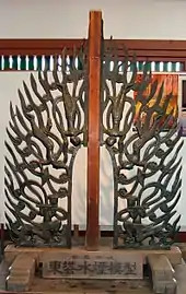 - The base or dew basin (露盤, roban, lit. "external bow"l), on which rests the entire finial. Because it covers the top of the roof in order to prevent leaks, it normally has as many sides as the roof itself (four, six or eight).[11]