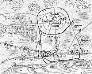 Sơn Tây lay a few kilometres to the south of the Red River. The town was protected by a kite-shaped pentagonal curtain wall just over eleven feet high, with three short sides facing roughly east and two long sides converging to a sharp point to the west of the town. The curtain wall was enclosed on all five sides by a wide, deep moat filled with water and by a tall bamboo palisade. Even if an attacker crossed these obstacles and breached the curtain wall, he still had to capture the central citadel of Sơn Tây. The citadel, built by Vietnamese engineers on the model of the French citadels of Cochinchina, lay at the heart of the town. It was square-shaped, and its walls were 300 metres long. It was dominated by a watchtower 18 metres high. According to the reports that the French had received, there were at least a hundred cannon in battery behind the defences.[4]