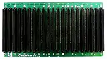 The S-100 bus is a passive backplane of 100-pin printed circuit board edge connectors wired in parallel. Circuit cards measuring 5 × 10-inches serving the functions of CPU, memory, or I/O interface plugged into these connectors. The bus signal definitions closely follow those of an 8080 microprocessor system, since the Intel 8080 microprocessor was the first microprocessor hosted on the S-100 bus. The 100 lines of the S-100 bus can be grouped into four types: 1) Power, 2) Data, 3) Address, and 4) Clock and control.[1]