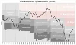 In 1958, Wattenscheid joined the Verbandsliga Westfalen (III) and a title there in 1969 saw the club promoted to the Regionalliga West (II). Despite a Regionalliga title in 1974 they did not move up due to the restructuring of the German competition, but instead continued to play second-division football in the newly formed 2. Bundesliga Nord. Through a period from the late 70s on to the late 80s the team struggled somewhat, earning uneven results and having several close brushes with relegation. They played well enough to earn a 10th-place finish in 1981 and stay up when the 2. Bundesliga Nord and 2. Bundesliga Süd were combined into a single division, but the next year they escaped being sent down in the bottom four only because TSV 1860 Munich was denied a license and was instead forced down to tier III play.