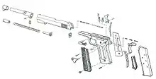 When examining the design of the Browning 1910, it can be seen there are a number of parts that introduce inaccuracy in the movement of the barrel as it cycles. The barrel bushing, slide, pivoting link and the mating of the groves in the slide must all move consistently for the handgun to function. But to function reliably, particularly as the handgun starts to become fouled with powder residue or dirt, these parts must be machined so the dirt that builds up will not cause them to stop functioning. As a result, the Colt M1911 was regarded as an inaccurate handgun.[5]