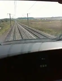 The train set ran with larger wheels, and the catenary voltage was increased to 31 kV from the standard 25 kV.[4] The maximum speed was achieved near kilometer post 193 on the LGV Est between Meuse and Champagne-Ardenne TGV stations.