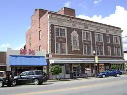 The SOWEGA Building or Southwest Georgia Melon Growers Association Building (also known as The Watermelon Building) in Adel, Georgia at 100 South Hutchinson Avenue (US 41), at the corner with Fourth Street. (SOWEGA comes from SOuth WEst GeorgiA - and "GA" is the abbreviation for "Georgia".) It was built in 1930. It is three stories tall and made of red brick, built in a commercial style. It has a roof deck and a basement. It is made of concrete reinforced with steel. Terracotta trim accents the exterior. The base is finished in marble. It features unique green terracotta watermelons in terracotta lozenges in a broad diamond, which represent the SOWEGA trademark. The third floor was remodeled in the early 1960s and the ground floor was remodeled in 1988. It was listed on the National Register of Historic Places in 1990.[1][2] The Adel-Cook County Chamber of Commerce currently uses the building.[3]