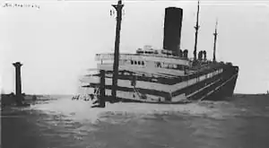 On March 11 the vessel was abandoned by her owners to the underwriters, with James Hill collecting $2,500,000.00 in insurance money.[26] The wreck was subsequently examined by divers who claimed the bottom had only four holes on the starboard side and the prospects of refloating the vessel were not as bad as they originally thought.[22] Salvage operations commenced on March 19 but only lasted four days as Dakota broke amidships during a gale on March 22–23. Only about 5% of her cargo was saved.[27] By May 1907 the wreck completely broke up and disappeared under water.