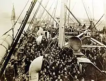 By 1907 predictions of economic trouble had become fact with the consequence, in the words of His Majesty's consul in Manila in his report for 1907, that "the American flag disappears from the Pacific trade with the single exception of the Northern Pacific Steamship Company's passenger-freighter Minnesota."[25][note 3] Robert Dollar noted that Pacific Mail anticipated enforcement of a seamen's act that would "make it impossible to operate American ships profitably in foreign trade" competing with foreign lines and sold its ships before waiting until the act was actually enforced—as it was not.[26] In a Pacific left "almost devoid of the American flag" by 1916 the five ships Korea, Siberia, China, Mongolia and Manchuria had been sold in the fall of 1915 to International Mercantile Marine Company for $5,250,000 (£1,075,000) which registered most of its ships under the British flag.[6][27][28] The ship began service with one of International Mercantile Marine's subsidiary companies, the American Line, in 1915.[6][note 4]
