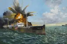 After a brief period for the ship's crew and passengers to board her four lifeboats, the U-boat fired a torpedo at the rudder and then shelled the vacated ship at the bridge. Once the ship disappeared beneath the waves, the submarine's crew pulled up to Captain W. E. Myers' lifeboat, left him with four tins of pressed black bread (which "the lifeboat passengers found ... too tough to eat")[2] and two tins of butter, and explained that the ship had been sunk because she was carrying supplies to Germany's enemy.