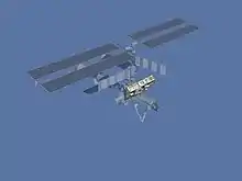 ![]() Canadarm2 grapples the first segment of the ISS' Integrated Truss Structure | |