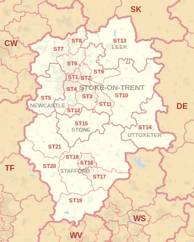 The ST postcode area, also known as the Stoke-on-Trent postcode area,[2] is a group of 21 postcode districts in England, within six post towns. These cover much of north and central Staffordshire (including Stoke-on-Trent, Stafford, Leek, Newcastle-under-Lyme, Stone and Uttoxeter), plus very small parts of Cheshire and Derbyshire.