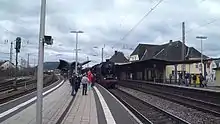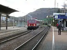 The first station on the territory of today's Saarlouis was opened in Fraulautern on 16 December 1858 during the construction of the Saar line.[4] However, Saarlouis was cut off from rail traffic, which hindered its economic development and the city fell behind the neighbouring communities of Dillingen and Bous. This initially led to the establishment of the Straßen- und Kleinbahnen im Kreis Saarlouis (Tramways and Light Railways in the District of Saarlouis). In addition, it was decided to construct a railway station in the current district of Roden.[5] Saarlouis station was opened on the present site on 19 December 1912.[6] From the mid-1960s the station was connected to the electrical network of Deutsche Bundesbahn after the station was renamed as Saarlouis Hauptbahnhof (literally “main station”, although there are no other stations in Saarlouis). Until 2002, InterRegio services also stopped in Saarlouis; since then the station has only been served by regional services.