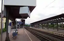 The station has three platforms tracks and three freight tracks that have no platform. Platform 1 has a length of 314 m and a height of 76 cm, track 2 and 3 are each 300 m long and 55 cm high.[7] Barrier-free access for the disabled is only possible on platform 1. Tracks 2 and 3 are only accessible via a pedestrian tunnel with stairs. The station has a travel centre. In front of the station there are parking spaces, bicycle parking, taxi stands and restrooms. The station building was replaced as part of a renovation program for stations in the Saarland, which was completed in 2012.[8] In 1967, relay interlocking was installed at the station.[9]