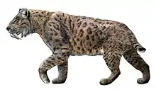 A saber-toothed cat (alternatively spelled sabre-toothed cat[1]) is any member of various extinct groups of predatory mammals that are characterized by long, curved saber-shaped canine teeth which protruded from the mouth when closed. The saber-toothed cats have been found almost worldwide from the Eocene epoch to the end of the Pleistocene epoch 42 million years ago (mya) – 11,000 years ago (kya).[2][3][4] The first saber-toothed cat fossil in Canada was found in Medicine Hat, Alberta.[5]