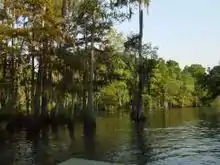 The river drains an area of 9,756 square miles (25,270 km2),[4] of which 7,426 square miles (19,230 km2) are in Texas and 2,330 square miles (6,000 km2) in Louisiana.[7] It flows through an area of abundant rainfall and discharges the largest volume of any river in Texas.[7] The name Sabine (Sp: Río de Sabinas) comes from the Spanish word for cypress, in reference to the extensive growth of bald cypresses along the lower river. The river flows through an important petroleum-producing region, and the lower river near the Gulf is among the most industrialized areas of the southeastern United States. The river was often described as the dividing line between the Old South and the New Southwest.