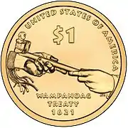 The reverse of the 2011 dollar depicts the hands of the Supreme Sachem Ousamequin and Plymouth Colony Governor John Carver holding a ceremonial pipe, along with the inscriptions "UNITED STATES OF AMERICA", "$1", and "WAMPANOAG TREATY 1621".[15] The coin was designed by Artistic Infusion Program artist Richard Masters and engraved by Mint sculptor–engraver Joseph Menna.[15] The design subject is treaties with tribal nations.[15]