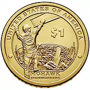 The reverse design of the 2015 dollar depicts Mohawk ironworkers. According to the U.S. Mint, the coin commemorates Kahnawake and Akwesasne Mohawk ironworkers who contributed to the building of New York City skyscrapers.[20] The inscriptions on the reverse read "UNITED STATES OF AMERICA", "$1" and "MOHAWK IRONWORKERS."[20] It was designed by artist Ronald D. Sanders.[21]