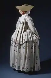 The casaquin (popularly known from the 1740s onwards as a pet-en-l'air) was an abbreviated version of the robe à la française worn as a jacket for informal wear with a matching or contrasting petticoat.[1][2] The skirt of the casaquin was knee-length but gradually shortened until by the 1780s it resembled a peplum.[2]