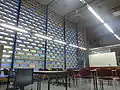 The large cream-coloured façade acts as the solid feature to the flow to the Warrigal Road traffic, which also blends into the fabric of the adjacent brick domestic housing. A pattern of rectangular opaque coloured glazing (which alludes to medieval precedent) is embedded into the brick façade which act as soft light walls for the interior classrooms, which help complement the solid steel structure exposed on both exterior and interior. Above the wall are timber slats which line the under-side of the ceiling on the exterior. The steel structures are notably evident primarily in the courtyard; pilotis which support sections of the first level thus allowing more space and movement below. These columns create a sense of internal colonnade within the space. The square plan provides many spatial and environmental qualities to the building; a 360° view of adjacent classrooms, a divide between the noise of the constant traffic on Warrigal Road and the students within in attempt to establish quietness and seclusion, and allowing sun and air to enter through the void which circulates into the classrooms. The two rows of small rectangular windows on the first floor also allow for such circulation, which are precedent of early Renaissance Florentine palazzo, a building form that Romberg admired. The square plan not only echoes in the fenestration, but also in the checked pattern on the courtyard pavement. The initial design of five classrooms in the building was allocated at the first floor (which was to accommodate for only 150 students).[1]
