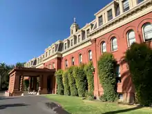 Main Building (1898) – Repaired and restored after the 1906 and 1989 earthquakes, the Main Building houses school-wide administrative offices, classrooms, meeting and reception rooms, a chapel, and two libraries. At the time of its construction, the design was described as "in the Italian Romanesque style, the foundations of concrete, the superstructure of red stock brick, with stone and terra-cotta trimmings and a slate roof."[9] After its 1913 reconstruction, it affected "a monumental French Second Empire design."[81] Combined with the adjoining, 350-seat Performing Arts Center, it forms an open courtyard that partially encloses a labyrinth and grotto.