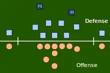 Safety, historically known as a safetyman, is a position in gridiron football played by a member of the defense. The safeties are defensive backs who line up from ten to fifteen yards from the line of scrimmage who can play as linebackers or deep as normal safeties. There are two variations of the position in a typical American formation: the free safety (FS) and the strong safety (SS). Their duties depend on the defensive scheme. The defensive responsibilities of the safety and cornerback usually involve pass coverage towards the middle and sidelines of the field, respectively. While American (11-player) formations generally use two safeties, Canadian (12-player) formations generally have one safety and two defensive halfbacks, a position not used in the American game. As professional and college football have become more focused on the passing game, safeties have become more involved in covering the eligible pass receivers.[1]