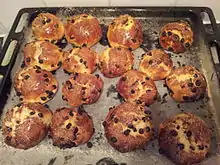 The "revel bun" from Cornwall is baked for special occasions, such as anniversary feasts (revels), or the dedication of a church. Saffron was historically grown in the mild climate of Devon & Cornwall but its likely that saffron from Spain had been traded for centuries before.[2] In the West of Cornwall, large saffron buns are also known as "tea treat buns" and are associated[3] with Methodist Sunday school outings or activities. In parts of Britain, the buns were traditionally baked on sycamore leaves and dusted with powdered sugar.