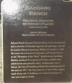 Sahuaro Ranch was founded in 1886, by William Henry Bartlett, a native of Illinois. The ranch, located north of what eventually became the city of Glendale, Arizona, was rich in figs and other fruit orchards, vineyards, and fields of alfalfa. The ranch has all of its historical structures restored, and the "Sahuaro Ranch Park" is administered by the Parks and Recreation Department of Glendale.