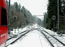 The Saignelégier–Glovelier railway is a railway built and operated by the Régional Saignelégier–Glovelier (RSG) company as a standard-gauge railway from Saignelégier to Glovelier in Switzerland. In 1944, the railway was merged to form the Chemins de fer du Jura (CJ), which converted the line to metre gauge and electrified it at 1500 Volt DC.