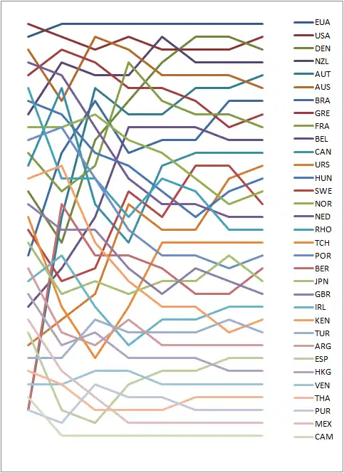 Graph showing the daily standings in the Finn during the 1964 Summer Olympics