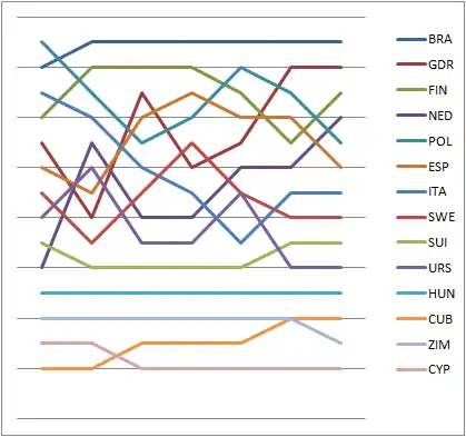 Graph showing the daily standings in the 470 during the 1980 Summer Olympics